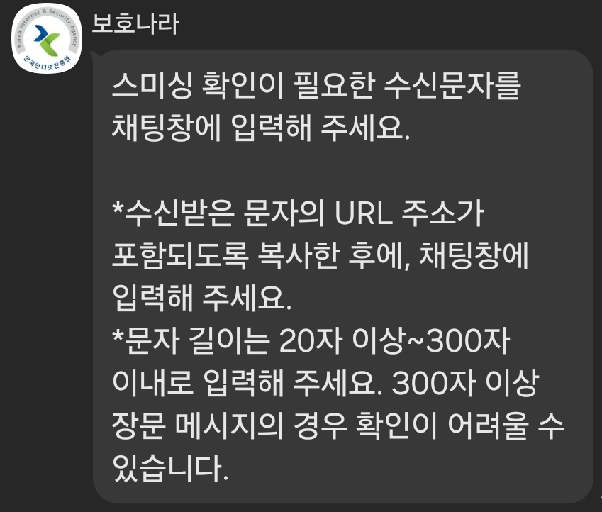스미싱 메뉴를 클릭하면 해당 내용을 입력하라고 나옵니다. 저는 미심쩍은 문자나 url 이 오면 바로 지우긴 합니다. 하지만 나와 관련된 정보나 연관된 내용이면 궁금할 수 있으니 보호나라에서 확인해 보시면 되겠습니다.