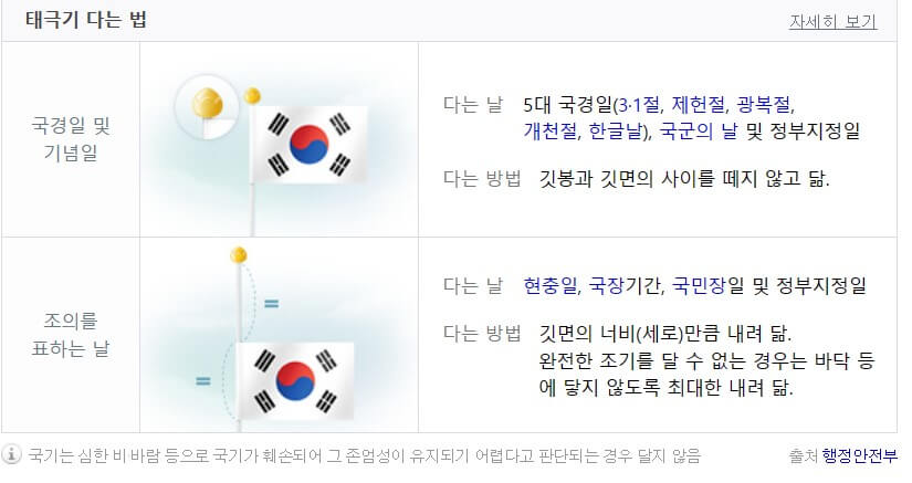 현충일, 국장기간, 국민장일에는 조기를 다는데 깃면의 세로 너비만큼 깃봉에서 내려서 게양합니다. 조기를 완전하게 달 수 없을 경우에는 바닥 등에 닿지 않도록 최대한 내려서 게양합니다.